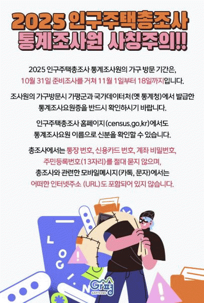 [NWS¹æ¼Û=Çѽ¸ñ ±âÀÚ]°¡Æò±ºÀº ±¹°¡µ¥ÀÌÅÍó(¿¾ Åë°èû)°¡ ÁÖ°üÇÏ´Â ¡®2025 Àα¸ÁÖÅÃÃÑÁ¶»ç¡¯°¡ ÁøÇàµÊ¿¡ µû¶ó, Á¶»ç¿øÀ» »çĪÇÑ º¸À̽ºÇÇ½Ì ¹× °³ÀÎÁ¤º¸ À¯Ãâ ÇÇÇØ¿¡ ´ëÇÑ °¢º°ÇÑ ÁÖÀǸ¦ ´çºÎÇß´Ù. À̹ø Àα¸ÁÖÅÃÃÑÁ¶»ç´Â ¿À´Â 11¿ù 1¡¦