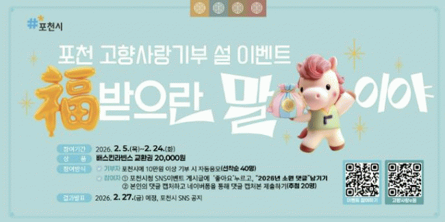 [NWS¹æ¼Û=Çѽ¸ñ ±âÀÚ]Æ÷õ½Ã´Â ¿À´Â 24ÀϱîÁö ¡®Æ÷õ °íÇâ»ç¶û±âºÎÁ¦ À̺¥Æ®¡¯¸¦ ÁøÇàÇÑ´Ù. À̹ø À̺¥Æ®´Â ¼³ ¸íÀýÀ» °è±â·Î °íÇâ»ç¶û±âºÎÁ¦¿¡ ´ëÇÑ Âü¿©¸¦ Ȱ¼ºÈ­Çϰí, ¡®2026³â ¼Ò¿ø¡¯À» °øÀ¯ÇÏ¸ç »õÇØÀÇ Èñ¸Á°ú µû¶æÇÑ Á¤À» ³ª´©±â ¡¦