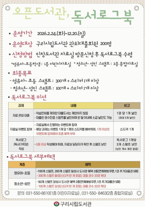 [»çȸ] ±¸¸®½Ã ÀÎâµµ¼­°ü, 2¿ùºÎÅÍ '¿Àǵµ¼­°ü, µ¶¼­·Î±×ºÏ' ¿î¿µ |2026. 02.20