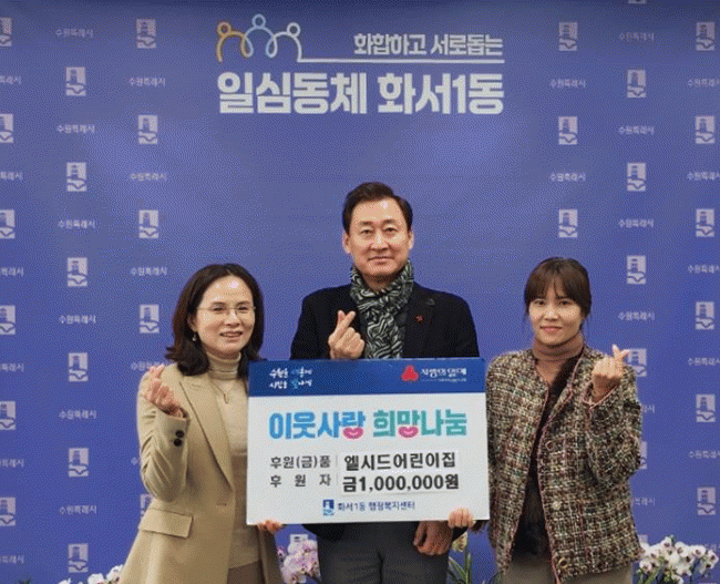 [NWS¹æ¼Û=Çѽ¸ñ ±âÀÚ]¼ö¿ø½Ã ÆÈ´Þ±¸ È­¼­1µ¿Àº Áö³­ 9ÀÏ, °ü³» ¿¤½Ãµå¾î¸°ÀÌÁýÀÌ Áö¿ª ³» ¾î·Á¿î ÀÌ¿ôÀ» µ½±â À§ÇØ È­¼­1µ¿ ÇàÁ¤º¹Áö¼¾ÅÍ¿¡ Çö±Ý 100¸¸ ¿øÀ» ÈÄ¿øÇß´Ù°í ¹àÇû´Ù. À̹ø ÈÄ¿ø±ÝÀº ¿¤½Ãµå¾î¸°ÀÌÁýÀÌ ³ª´®°ú ºÀ»çÀÇ °¡Ä¡¸¦ ¡¦
