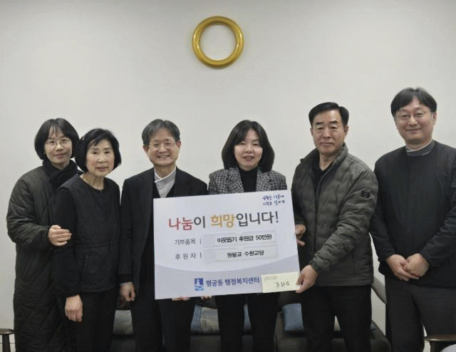 [NWS¹æ¼Û=Çѽ¸ñ ±âÀÚ]¼ö¿ø½Ã ÆÈ´Þ±¸ Çà±Ãµ¿Àº Áö³­ 9ÀÏ, ¿øºÒ±³ ¼ö¿ø±³´çÀÌ Áö¿ª ³» Ãë¾à°èÃþÀ» µ½±â À§ÇØ ¼º±Ý 50¸¸¿øÀ» Àü´ÞÇϸç ÀÌ¿ôµ¹º½ ½Çõ¿¡ µ¿ÂüÇß´Ù°í ¹àÇû´Ù. À̹ø ¼º±ÝÀº µµ¿òÀÌ ÇÊ¿äÇÑ ÀÌ¿ôÀ» Áö¿ª»çȸ°¡ ÇÔ²² »ìÇǰí Áö¿ø¡¦