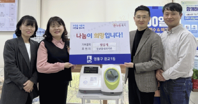 [NWS¹æ¼Û=Çѽ¸ñ ±âÀÚ]¼ö¿ø½Ã ¿µÅ뱸 ±¤±³1µ¿Àº Áö³­ 10ÀÏ ±¤±³ÈÞ³»°úÀÇ¿øÀ¸·ÎºÎÅÍ Ç÷¾Ð°è 1´ë¸¦ ±âºÎ¹Þ¾Æ ÇàÁ¤º¹Áö¼¾ÅÍ¿¡ ºñÄ¡Çß´Ù°í ¹àÇû´Ù. À̹ø ±âºÎ´Â ¾î¸£½Å°ú Ãë¾à°èÃþÀÌ ½º½º·Î Ç÷¾ÐÀ» È®ÀÎÇÏ°í °Ç°­À» °ü¸®ÇÒ ¼ö ÀÖµµ·Ï µ½±â À§¡¦