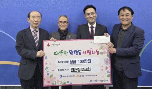 [NWS¹æ¼Û=Çѽ¸ñ ±âÀÚ]¼ö¿ø½Ã ¿µÅ뱸 ¿øÃµµ¿Àº Áö³­ 10ÀÏ ¿øÃµÀå·Î±³È¸°¡ Áö¿ª ³» Àú¼Òµæ ÁֹεéÀ» µ½±â À§ÇØ ¼º±Ý 100¸¸ ¿øÀ» ÇàÁ¤º¹Áö¼¾ÅÍ¿¡ ±âŹÇß´Ù°í ¹àÇû´Ù. À̹ø¿¡ Àü´ÞµÈ ¼º±ÝÀº °æ±â»çȸº¹Áö°øµ¿¸ð±Ýȸ¿¡ ¿¹Ä¡µÇ¾î °æÁ¦ÀûÀ¸·Î ¡¦