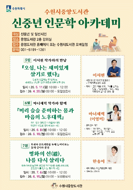 [NWS¹æ¼Û=Çѽ¸ñ ±âÀÚ]¼ö¿ø½Ã Áß¾Óµµ¼­°üÀÌ 5¿ùºÎÅÍ 7¿ù±îÁö ¸Å´Þ 1ȸ ¿î¿µÇÏ´Â ¡®½ÅÁß³â Àι®ÇÐ ¾ÆÄ«µ¥¹Ì¡¯ ¼ö°­»ýÀ» ¸ðÁýÇÑ´Ù. °­¿¬Àº ½ÅÁß³â°ú ÀÏ¹Ý ½Ã¹Î 30¸íÀ» ´ë»óÀ¸·Î ÁøÇàÇÑ´Ù. ¡ã5¿ù À̼­¿ø ÀÛ°¡¿ÍÀÇ ¸¸³² '¿À½Ê, ³ª´Â Àç¹ÌÀÖ°Ô¡¦