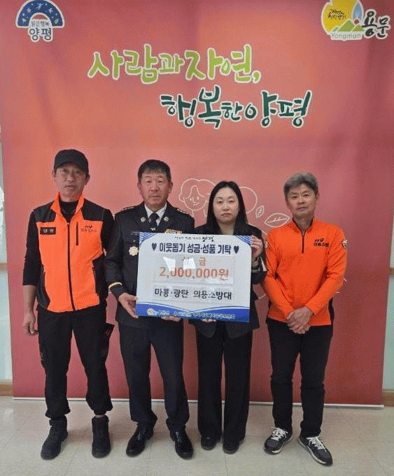 [NWS¹æ¼Û=Çѽ¸ñ ±âÀÚ]¾çÆò±º ¿ë¹®¸éÀº ¿ë¹®¸é ¸¶·æ¸®¡¤±¤Åº¸® ÀÇ¿ë¼Ò¹æ´ë°¡ Áö³­ 10ÀÏ ÀÌ¿ô µ½±â ¼º±Ý 200¸¸ ¿øÀ» Àü´ÞÇϸç, ¸Å³â À̾î¿À°í ÀÖ´Â ±âºÎȰµ¿À» ¿ÃÇØµµ ²ÙÁØÈ÷ À̾´Ù°í ¹àÇû´Ù. À̹ø ±âºÎ±ÝÀº ´ë¿øµéÀÌ ¼ö»ó¾ÈÀü¿ä¿øÀ¸·Î¡¦
