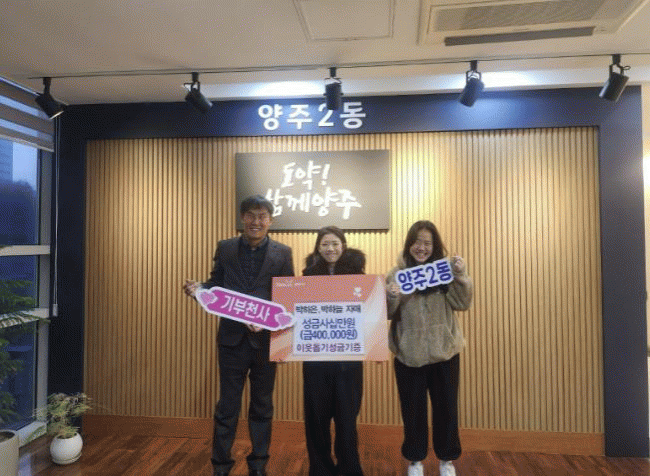 [NWS¹æ¼Û=Çѽ¸ñ ±âÀÚ]¾çÁֽà ¾çÁÖ2µ¿ÀÌ Áö³­ 15ÀÏ ¹ÚÇÏÀº¡¤¹ÚÇÏ´Ã ÀڸŷκÎÅÍ °ü³» ¾î·Á¿î ÀÌ¿ôÀ» À§ÇÑ ¼º±Ý 40¸¸ ¿øÀ» ±âŹ¹Þ¾Ò´Ù. À̹ø ¼º±ÝÀº 1³â°£ ÀڸŰ¡ ¿ëµ·À» ¾Æ²¸ ¸ð¾Æ ¸¶·ÃÇÑ °ÍÀ¸·Î, µÎ ÀڸŴ 2018³âºÎÅÍ ¸Å³â ²ÙÁØÈ÷ ¾çÁÖ¡¦