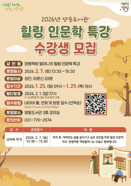 [»çȸ] ¾çµ¿µµ¼­°ü, ¼ºÀÎÀ» À§ÇÑ 'Èú¸µ Àι®ÇРƯ°­' ¼ö°­»ý ¸ðÁý |2026. 01.23