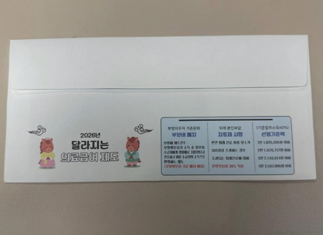 [NWS¹æ¼Û=Çѽ¸ñ ±âÀÚ]ÀÇÁ¤ºÎ½Ã´Â 2026³âºÎÅÍ ´Þ¶óÁö´Â ÀÇ·á±Þ¿© Á¦µµÀÇ ÇÙ½É ³»¿ëÀ» ½Ã¹Îµé¿¡°Ô ½Å¼ÓÇÏ°Ô ¾Ë¸®±â À§ÇØ ÁÖ¿ä º¯°æ »çÇ×À» ´ãÀº ¸ÂÃãÇü ¿ìÆíºÀÅõ¸¦ Á¦ÀÛÇß´Ù°í 5ÀÏ ¹àÇû´Ù. À̹ø ºÀÅõ Á¦ÀÛÀº ¼ö±Þ±ÇÀÚ ¼±Á¤ ±âÁذú º»ÀκΡ¦