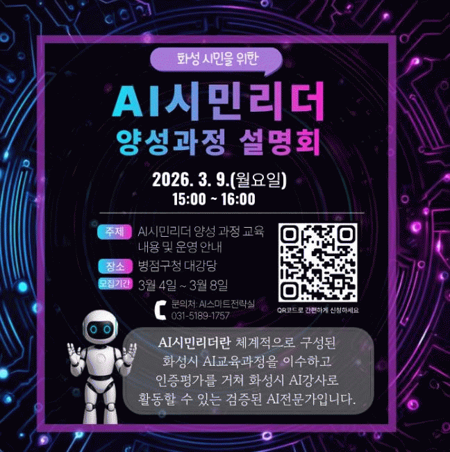 [NWS¹æ¼Û=Çѽ¸ñ ±âÀÚ]È­¼ºÆ¯·Ê½Ã´Â ½Ã¹ÎÀÌ ÇнÀÇÏ°í ±³À°ÇÏ´Â ÀΰøÁö´É(AI) ÇнÀ ü°è ±¸ÃàÀ» À§ÇØ ¡®2026³â AI½Ã¹Î¸®´õ ¾ç¼º ±³À°¡¯ ¼³¸íȸ¸¦ 3¿ù 9ÀÏ ¿ÀÈÄ 3½Ã¿¡ º´Á¡±¸Ã» ´ë°­´ç¿¡¼­ °³ÃÖÇÑ´Ù. À̹ø ¼³¸íȸ¿¡¼­´Â ¡®AI½Ã¹Î¸®´õ¡¯ ¾ç¡¦