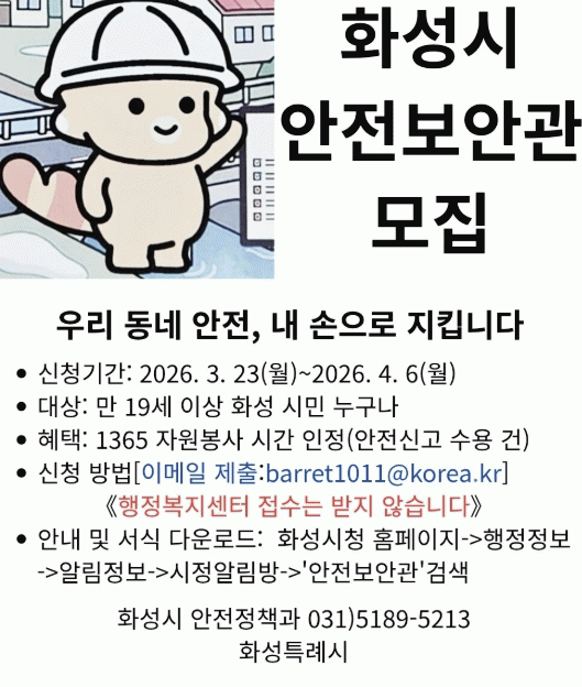 [NWS¹æ¼Û=Çѽ¸ñ ±âÀÚ]È­¼ºÆ¯·Ê½Ã´Â Áö¿ª ³» ¾ÈÀü¹®È­ È®»ê°ú »ýȰ ¼Ó À§Çè¿ä¼ÒÀÇ »çÀü ¹ß±¼¡¤Á¦°Å¸¦ À§ÇØ ¾ÈÀüº¸¾È°ü 145¸íÀ» °ø°³ ¸ðÁýÇÑ´Ù°í 23ÀÏ ¹àÇû´Ù. ¸ðÁý ±â°£Àº 3¿ù 23ÀϺÎÅÍ 4¿ù 6ÀϱîÁö¸ç, °ø°íÀÏ ±âÁØ Áֹεî·Ï»ó È­¼º½Ã¿¡¡¦