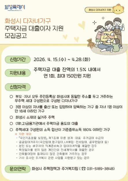 [NWS¹æ¼Û=Çѽ¸ñ ±âÀÚ]È­¼ºÆ¯·Ê½Ã°¡ ¹«ÁÖÅà ½ÅÈ¥ºÎºÎ¿Í ´ÙÀÚ³à °¡±¸ÀÇ ÁְźδãÀ» ¿ÏÈ­ÇÏ°í ¾ÈÁ¤ÀûÀÎ Á¤ÂøÀ» µ½±â À§ÇØ 2026³â ÁÖÅÃ(Àü¼¼)ÀÚ±Ý ´ëÃâÀÌÀÚ Áö¿ø»ç¾÷ ´ë»óÀÚ¸¦ ¸ðÁýÇÑ´Ù. À̹ø »ç¾÷Àº Ãâ»ê°ú À°¾Æ·Î ÀÎÇÑ °æÁ¦Àû ºÎ´ãÀ» ´ú°í¡¦
