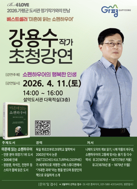 [NWS¹æ¼Û=Çѽ¸ñ ±âÀÚ]°¡Æò±ºµµ¼­°üÀÌ ¿ÃÇØ ¡®Á¤±â ÀÛ°¡ÀÇ ¸¸³²¡¯À» ÅëÇÑ Àι®ÇÐ °­¿¬À» 4ȸ¿¡ °ÉÃÄ ¸¶·ÃÇÑ´Ù. ±º µµ¼­°üÀº ¿ÃÇØ ù °­¿¬À¸·Î ¿À´Â 4¿ù 11ÀÏ ¼³¾Çµµ¼­°ü¿¡¼­ °­¿ë¼ö ÀÛ°¡¸¦ ÃÊÃ»ÇØ ¡®¼îÆæÇÏ¿ì¾îÀÇ Çູ·Ð¡¯À» ÁÖÁ¦·Î °­¿¬¡¦
