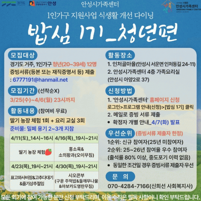 [»çȸ] ¾È¼º½Ã °¡Á·¼¾ÅÍ, 1ÀÎ °¡±¸ Áö¿ø»ç¾÷ ½Ä»ýȰ °³¼± ´ÙÀÌ´× '¹ä½É 1±â' û³â Âü¿©ÀÚ ¸ðÁý |2026. 03.27