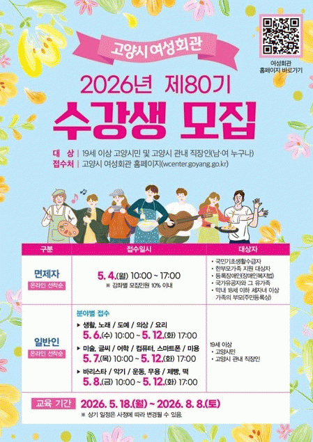 [NWS¹æ¼Û=Çѽ¸ñ ±âÀÚ]°í¾çƯ·Ê½Ã ¿©¼ºÈ¸°üÀº ¿À´Â 5¿ù 4ÀϺÎÅÍ 12ÀϱîÁö 2026³â Á¦80±â Á¤±Ô°­Á ¼ö°­»ýÀ» ¸ðÁýÇÑ´Ù. À̹ø Á¤±Ô°­Á´ ¿À´Â 5¿ù 18ÀϺÎÅÍ 8¿ù 8ÀϱîÁö ÃÑ 12ÁÖ °úÁ¤À¸·Î, ¡âÀÇ»ó ¡â¿ä¸® ¡â¹Ì¼ú¡¤±Û¾¾ ¡â¹Ì¿ë ¡â¿îµ¿¡¤¹«¡¦