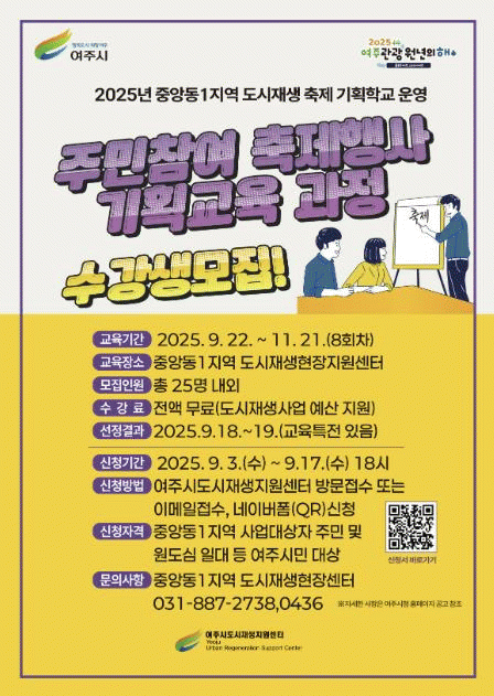 [»çȸ] ¿©Áֽà µµ½ÃÀç»ýÁö¿ø¼¾ÅÍ, '2025³â Áß¾Óµ¿1Áö¿ª ÃàÁ¦ Çà»ç ±âȹÇб³' ¼ö°­»ý ¸ðÁý |2025. 09.09