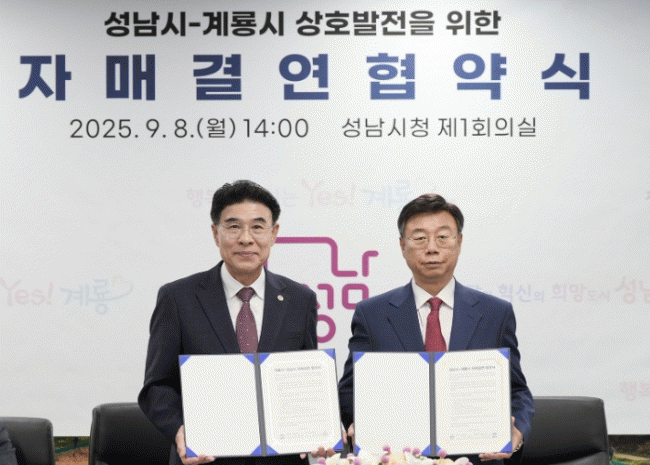 [NWS¹æ¼Û=Çѽ¸ñ ±âÀÚ]¼º³²½Ã´Â 9¿ù 8ÀÏ ÃæÃ»³²µµ °è·æ½Ã¿Í ¿ìÈ£¡¤±³·ù ÁõÁø°ú µ¿¹Ý ¼ºÀåÀ» À§ÇÑ ÀڸŰῬ Çù¾àÀ» ü°áÇß´Ù. À̳¯ ¿ÀÈÄ 2½Ã ¼º³²½Ãû 4Ãþ Á¦1ȸÀǽǿ¡¼­ ¿­¸° Çù¾à½Ä¿¡´Â ½Å»óÁø ¼º³²½ÃÀå°ú ÀÌÀÀ¿ì °è·æ½ÃÀå µîÀÌ Âü¼®Çß¡¦