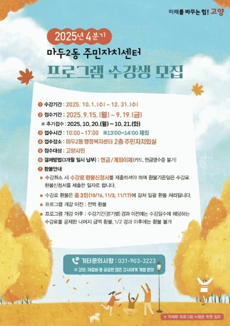 [»çȸ] °í¾ç½Ã ¸¶µÎ2µ¿ ÁÖ¹ÎÀÚġȸ, 2025³â 4ºÐ±â ¹®È­°­Á ¼ö°­»ý ¸ðÁý |2025. 09.08