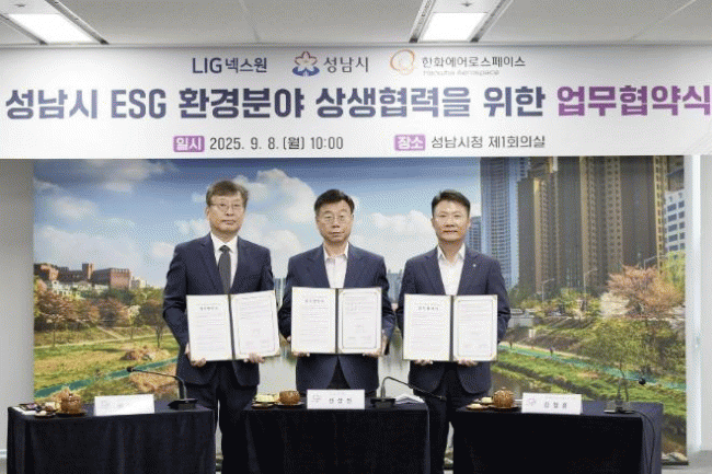 [NWS¹æ¼Û=Çѽ¸ñ ±âÀÚ]¼º³²½Ã´Â 9¿ù 8ÀÏ ¿ÀÀü 10½Ã ½Ãû 4Ãþ Á¦1ȸÀǽǿ¡¼­ ÆÇ±³ ¼ÒÀç 2°÷ ¹æÀ§»ê¾÷ ºÐ¾ß ±â¾÷°ú ¡®ÀÌ¿¡½ºÁö(ESG) ȯ°æ ºÐ¾ß »ó»ýÇù·ÂÀ» À§ÇÑ ¾÷¹« Çù¾à¡¯À» ü°áÇß´Ù. À̳¯ Çù¾à½Ä¿¡´Â ½Å»óÁø ¼º³²½ÃÀå°ú Â÷»óÈÆ LIG³Ø½º¡¦