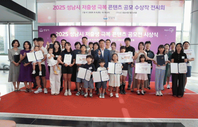 [NWS¹æ¼Û=Çѽ¸ñ ±âÀÚ]½Å»óÁø ¼º³²½ÃÀåÀº 6ÀÏ ¼º³²½Ãû ´©¸®È¦¿¡¼­ °³ÃÖµÈ ¡®2025³â ÀúÃâ»ý ±Øº¹ ÄÜÅÙÃ÷ °ø¸ðÀü¡¯ ½Ã»ó½Ä¿¡ Âü¼®ÇØ ¼ö»óÀÚµéÀ» °Ý·ÁÇß´Ù. À̹ø °ø¸ðÀüÀº ½Ã¹ÎµéÀÇ Ã¢ÀÇÀûÀÎ ¾ÆÀ̵ð¾î¸¦ ÅëÇØ ÀúÃâ»ý ¹®Á¦¿¡ ´ëÇÑ »çȸÀû °ü¡¦