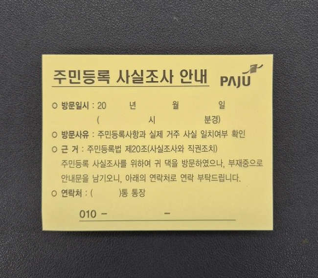 [»çȸ] ÆÄÁֽà ¿îÁ¤5µ¿, Áֹεî·Ï »ç½ÇÁ¶»ç ¹æ¹® ½Ã ÅëÀå¿¡°Ô ºÎÀçÁß ºÙÀÓÂÊÁö Á¦°ø |2025. 09.05