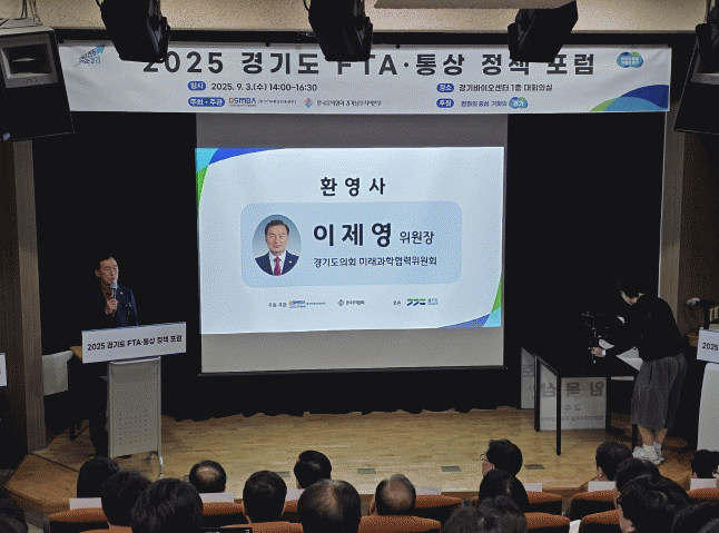 [NWS¹æ¼Û=Çѽ¸ñ ±âÀÚ]°æ±âµµÀÇȸ ¹Ì·¡°úÇÐÇù·ÂÀ§¿øÈ¸ ÀÌÁ¦¿µ À§¿øÀå(±¹¹ÎÀÇÈû, ¼º³²8)Àº 3ÀÏ ¼ö¿ø °æ±â¹ÙÀÌ¿À¼¾ÅÍ¿¡¼­ ¿­¸° '2025 °æ±âµµ FTA¡¤Åë»ó Á¤Ã¥ Æ÷·³'¿¡ Âü¼®ÇØ È¯¿µ»ç¸¦ Çß´Ù. À̹ø Æ÷·³Àº ±Û·Î¹ú Åë»ó ȯ°æ º¯È­¿Í ºñ°ü¼¼ À塦