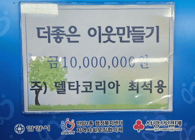 [NWS¹æ¼Û=Çѽ¸ñ ±âÀÚ]¾È¾ç½Ã ¸¸¾È±¸ ¾È¾ç1µ¿ ÇàÁ¤º¹Áö¼¾ÅÍ´Â ¢ßµ¨Å¸ÄÚ¸®¾Æ·ÎºÎÅÍ ¾È¾ç1µ¿ ¡®´õÁÁÀº ÀÌ¿ô¸¸µé±â¡¯ »ç¾÷ ¼º±Ý 1õ¸¸ ¿øÀ» Àü´Þ¹Þ¾Ò´Ù°í 4ÀÏ ¹àÇû´Ù. ¿ëÀνà ±âÈﱸ¿¡ À§Ä¡ÇÑ ¢ßµ¨Å¸ÄÚ¸®¾Æ´Â ºÐ¾ç´ëÇà¾÷°ú ÁÖ°Å¿ë °Ç¹° °³¹ß¡¦