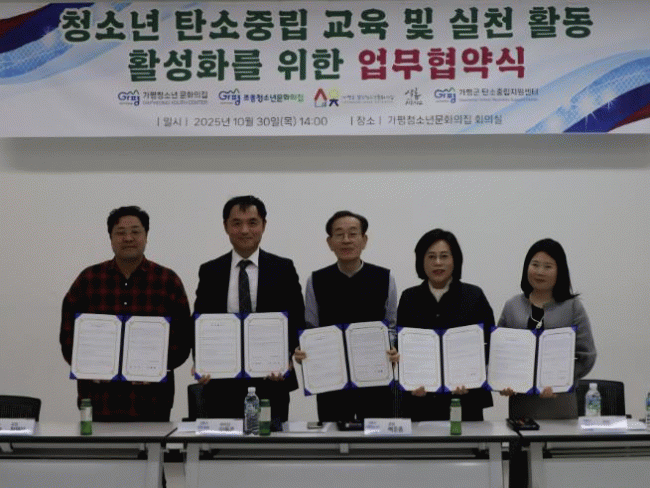 [NWS¹æ¼Û=Çѽ¸ñ ±âÀÚ]°¡Æò±º ź¼ÒÁ߸³Áö¿ø¼¾ÅÍ´Â 30ÀÏ °¡Æòû¼Ò³â¹®È­ÀÇÁý¿¡¼­ °¡Æò¡¤¼³¾Ç¡¤Á¶Á¾ û¼Ò³â¹®È­ÀÇÁý ¹× ¼£·ÒÀÚÀ¯±³À°°øµ¿Ã¼ µî 4°³ ±â°ü°ú ¡®°¡Æò±º ź¼ÒÁ߸³ ½Çõ¹®È­ È®»êÀ» À§ÇÑ °øµ¿Çù·Â ¾÷¹«Çù¾à¡¯À» ü°áÇß´Ù. À̹ø ¡¦
