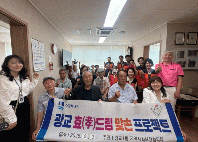 [NWS¹æ¼Û=Çѽ¸ñ ±âÀÚ]¼ö¿ø½Ã ¿µÅ뱸 ±¤±³1µ¿°ú ±¤±³1µ¿ Áö¿ª»çȸº¸ÀåÇùÀÇü´Â Áö³­ 9¿ù 3ÀÏ, ±¤±³ÇѾç¼öÀÚÀÎ °æ·Î´ç¿¡¼­ ¡®È¿µå¸² ¸Â¼Õ ÇÁ·ÎÁ§Æ®¡¯ÀÇ ¾ÆÈ© ¹øÂ° Çù¾à½ÄÀ» ÁøÇàÇϸç Áö¿ª»çȸ ¾î¸£½ÅµéÀ» À§ÇÑ »óÈ£ µ¹º½°ú ±³·ù¸¦ ÇÑÃþ ´õ¡¦