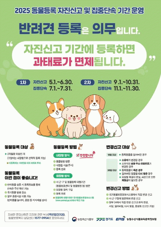 [NWS¹æ¼Û=Çѽ¸ñ ±âÀÚ]ÀÇÁ¤ºÎ½Ã´Â 9¿ù 1ÀϺÎÅÍ 10¿ù 31ÀϱîÁö ¡®2025³â µ¿¹°µî·Ï ÀÚÁø½Å°í ±â°£¡¯À» ¿î¿µÇϰí, À̾î 11¿ù 1ÀϺÎÅÍ 30ÀϱîÁö ÁýÁߴܼÓÀ» ÃßÁøÇÑ´Ù. µ¿¹°µî·Ï Á¦µµ´Â ¹Ý·Áµ¿¹°ÀÇ À¯½Ç?À¯±â ¹æÁö¿Í Ã¥ÀÓ ÀÖ´Â ¹Ý·Á¹®È­ È®»ê¡¦