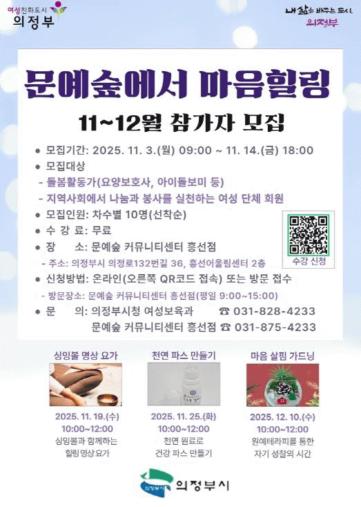 [»çȸ] ÀÇÁ¤ºÎ½Ã, '¹®¿¹½£¿¡¼­ ¸¶À½Èú¸µ' 11~12¿ù Âü°¡ÀÚ ¸ðÁý |2025. 10.31