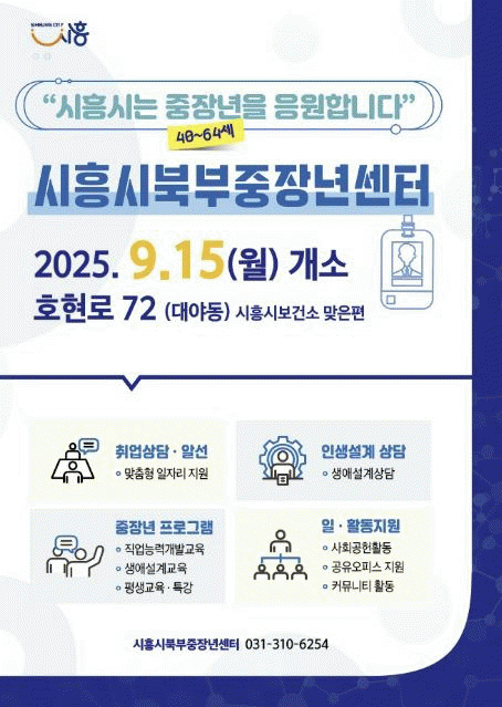 [NWS¹æ¼Û=Çѽ¸ñ ±âÀÚ]½ÃÈï½Ã´Â ÁßÀå³âÃþ Ãë¾÷ Áö¿ø°ú »çȸÂü¿© È®´ë¸¦ À§ÇØ ½ÃÈï½ÃºÏºÎÁßÀå³â¼¾Å͸¦ ¿À´Â 9¿ù 15ÀϺÎÅÍ Àӽà ¿î¿µÇÑ´Ù. À̹ø ¿î¿µÀº ³»³â »ó¹Ý±â Áß °ø½Ä °³Ã»½Ä Àü±îÁö ÁøÇàµÇ¸ç Á¤½Ä ¿î¿µ°ú µ¿ÀÏÇÏ°Ô ¼­ºñ½º¸¦ Á¦°øÇÑ´Ù¡¦