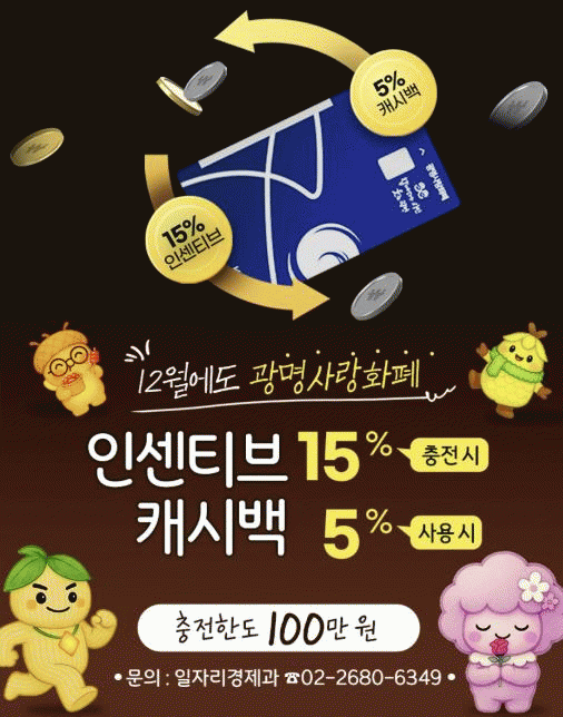 [NWS¹æ¼Û=Çѽ¸ñ ±âÀÚ]±¤¸í½Ã°¡ Áö¿ª°æÁ¦ Ȱ¼ºÈ­¸¦ À§ÇØ ¿¬¸»±îÁö ±¤¸í»ç¶ûÈ­Æó Àμ¾Æ¼ºê 15%¿Í ij½Ã¹é 5% Áö¿øÀ» À̾´Ù°í 28ÀÏ ¹àÇû´Ù. ÀÌ¿¡ µû¶ó ÃÖ´ë 100¸¸ ¿øÀ» ÃæÀüÇϸé 15¸¸ ¿øÀ» Ãß°¡ Áö±ÞÇØ ÃÑ 115¸¸ ¿øÀ» »ç¿ëÇÒ ¼ö ÀÖÀ¸¸ç,¡¦