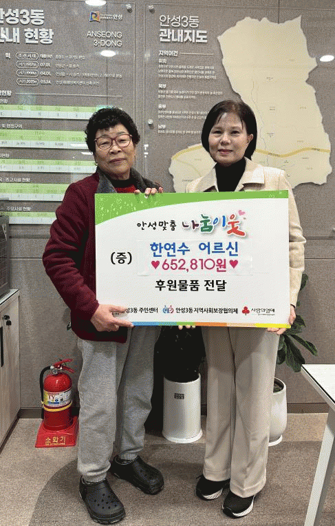 [NWS¹æ¼Û=Çѽ¸ñ ±âÀÚ]¾È¼º½Ã ¾È¼º3µ¿ÇàÁ¤º¹Áö¼¾ÅÍ´Â 2025³â 11¿ù 27ÀÏ, ÇÑ¿¬¼ö ¾î¸£½Å(74¼¼)À¸·ÎºÎÅÍ 652,810¿øÀÇ ±âºÎ±ÝÀ» Àü´Þ¹Þ¾Ò´Ù°í ¹àÇû´Ù. À̹ø ±âºÎ´Â ÇÑ ¾î¸£½ÅÀÌ Áö³­ÇØ ¾ÆµéÀ» ¶°³ªº¸³½ µÚ ½ÃÀÛÇÑ ³ª´® Ȱµ¿ÀÇ °á°ú·Î, Áö¿ª»ç¡¦
