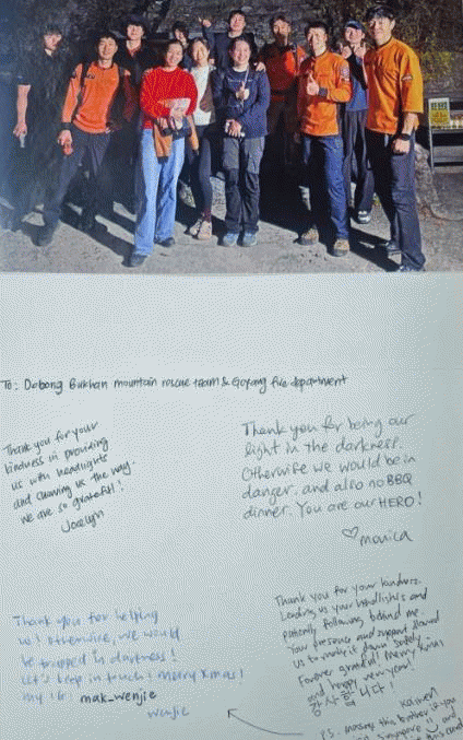 [NWS¹æ¼Û=Çѽ¸ñ ±âÀÚ]°æ±âµµ ±¸Á¶´ë¿øÀÇ È°µ¿À¸·Î ÀÚÄ© »ý¸íÀ» ÀÒÀ» ¼öµµ ÀÖ´Â »óȲ¿¡¼­ À§±â¸¦ ³Ñ±ä ¿Ü±¹ÀÎ °ü±¤°´ÀÌ °¨»ç ÆíÁö¸¦ º¸³½ »ç½ÇÀÌ ¾Ë·ÁÁ® È­Á¦´Ù. È­Á¦ÀÇ ÁÖÀΰøµéÀº °í¾ç¼Ò¹æ¼­ »ê¾Ç±¸Á¶´ë. 9ÀÏ °æ±âµµºÏºÎ¼Ò¹æÀç³­º»ºÎ¿¡¡¦