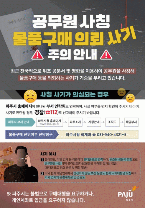 [NWS¹æ¼Û=Çѽ¸ñ ±âÀÚ]ÆÄÁֽô ÃÖ±Ù Àü±¹ÀûÀ¸·Î È®»ê ÁßÀÎ °ø¹«¿ø »çĪ »ç±â ÀüÈ­(º¸À̽º ÇǽÌ) ¹× °ø¹®¼­ À§Á¶¸¦ µ¿¹ÝÇÑ ¹°Ç°±¸¸Å »ç±â ½Ãµµ°¡ Áö¼ÓÀûÀ¸·Î ¹ß»ýÇÔ¿¡ µû¶ó, °ü³» ³³Ç°¾÷ü¿Í ½Ã¹Î ÇÇÇØ ¿¹¹æÀ» À§ÇØ °¢º°ÇÑ ÁÖÀǸ¦ ´çºÎÇß¡¦