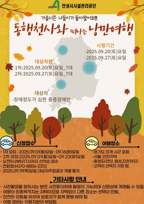 [NWS¹æ¼Û=Çѽ¸ñ ±âÀÚ]¾È¼º½Ã½Ã¼³°ü¸®°ø´Ü ±³Åë¾àÀÚÁö¿øÆÀ ¡®µ¿Çàõ»ç¡¯´Â ¿À´Â 9¿ù 20ÀÏ Åä¿äÀϰú 9¿ù 27ÀÏ Åä¿äÀÏ ÀÌÆ²°£ °¡À» ¿©Çà½ÃÁðÀ» ¸Â¾Æ Â÷·®Áö¿ø(À¯·á) ¼­ºñ½º ¡®µ¿Çàõ»ç¿Í ¶°³ª´Â ³¶¸¸¿©Ç࡯À» ½Ç½ÃÇÑ´Ù°í ¹àÇû´Ù. À̹ø Çà»ç¡¦