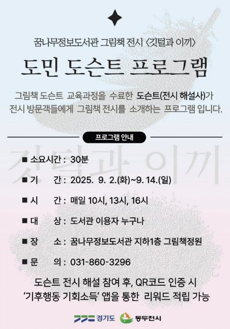 [NWS¹æ¼Û=Çѽ¸ñ ±âÀÚ]µ¿µÎõ½Ã µµ¼­¹®È­»ç¾÷¼Ò ²Þ³ª¹«Á¤º¸µµ¼­°üÀº 9¿ù 14ÀϱîÁö ¿­¸®´Â ¡®±êÅаú À̳¢¡¯ ±×¸²Ã¥ Àü½ÃÀÇ ¿øÈ°ÇÑ ¿î¿µÀ» À§ÇØ Àü¹®ÀûÀ¸·Î ¾ç¼ºµÈ ¡®°æ±âµµ¹Î ±×¸²Ã¥ µµ½¼Æ®¡¯¿Í ÇÔ²² Àü½Ã ÇØ¼³ ÇÁ·Î±×·¥À» ÁøÇàÇÑ´Ù. µµ½¼¡¦