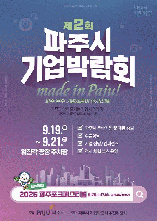 [NWS¹æ¼Û=Çѽ¸ñ ±âÀÚ]ÆÄÁֽô ¿À´Â 9¿ù 19ÀϺÎÅÍ 21ÀϱîÁö ÀÓÁø°¢ ±¤Àå¿¡¼­ ¿­¸®´Â ¡®2025 Á¦2ȸ ÆÄÁֽà ±â¾÷¹Ú¶÷ȸ ¡¯¸ÞÀ̵å ÀÎ ÆÄÁÖ(MADE IN PAJU!)¡¯ÀÇ °³ÃÖ¸¦ ¾ÕµÎ°í ¸·¹ÙÁö Áغñ¿¡ ¹ÚÂ÷¸¦ °¡Çϰí ÀÖ´Ù. 180¿© °³ ±â¾÷ÀÌ Âü¿©Çϴ¡¦