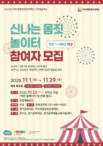 [»çȸ] ¿©ÁÖ¼¼Á¾¹®È­°ü±¤Àç´Ü ¾î¸°ÀÌ ´ë»ó ¹®È­¿¹¼ú±³À° '½Å³ª´Â ¼­Ä¿½º ¿¹¼ú³îÀÌÅÍ', '²¿¸¶ ½Åü³îÀÌ ±³½Ç' 2°Ç ÁøÇà |2025. 10.31