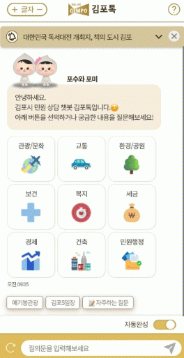 [NWS¹æ¼Û=Çѽ¸ñ ±âÀÚ]±èÆ÷½Ã´Â ¿À´Â 9¿ù 22ÀÏ ¿ÀÀü 9½ÃºÎÅÍ 24½Ã°£ ¹Î¿ø »ó´ãÀÌ °¡´ÉÇÑ Ãªº¿ ½Ã½ºÅÛ ¡®±èÆ÷Å塯 ¼­ºñ½º¸¦ º»°Ý °³½ÃÇÑ´Ù°í ¹àÇû´Ù. ¡®±èÆ÷Å塯Àº µðÁöÅÐ ÀüȯÀ¸·Î ½º¸¶Æ®ÆùÀÌ ÀÏ»óÈ­µÈ ½Ã¹Îµé¿¡°Ô ½Ã°£°ú Àå¼Ò¿¡ ±¸¾Ö¹Þ¡¦