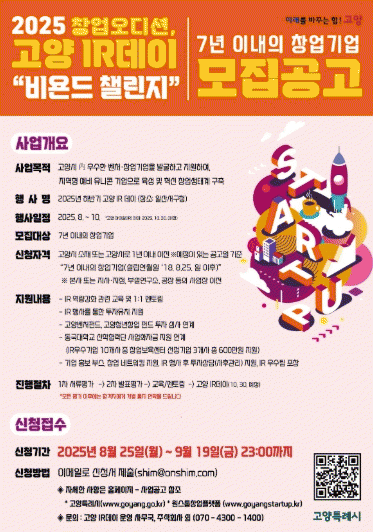 [NWS¹æ¼Û=ÇãÀº¼­ ±âÀÚ]°í¾çƯ·Ê½Ã´Â ¿ì¼öÇÑ Ã¢¾÷¡¤º¥Ã³±â¾÷À» ¹ß±¼Çϱâ À§ÇØ Ã¢¾÷°¡¿Í ÅõÀÚÀÚ¿ÍÀÇ ¸¸³²ÀÇ ÀåÀÎ ¡®2025 â¾÷¿Àµð¼Ç, °í¾ç¾ÆÀ̾Ë(IR)µ¥ÀÌ ºñ¿æµå 縰Áö¡¯¿¡ Âü¿©ÇÒ Ã¢¾÷±â¾÷À» ¸ðÁýÇÑ´Ù°í ¹àÇû´Ù. ½Åû´ë»óÀº °í¾çƯ·Ê½Ã¡¦