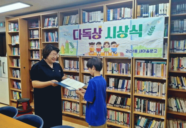 [NWS¹æ¼Û=Çѽ¸ñ ±âÀÚ]¼ö¿ø½Ã ±Ç¼±±¸ ±Ç¼±2µ¿ »õ¸¶À»¹®°í¿¡¼­´Â Áö³­ 27ÀÏ ¿©¸§¹æÇÐ ±â°£ µ¿¾È Ã¥À» °¡Àå ¸¹ÀÌ ÀÐÀº ¹®°í ÀÌ¿ëÀÚ¸¦ ¼±Á¤ÇÏ¿© ¡®´Ùµ¶»ó ½Ã»ó½Ä¡¯À» °³ÃÖÇß´Ù. À̹ø ½Ã»ó½Ä¿¡¼­´Â °ü³» ÃÊ¡¤ÁßÇлý 4¸í°ú Áö¿ªÁֹΠ1¸íÀÌ ¼±¡¦
