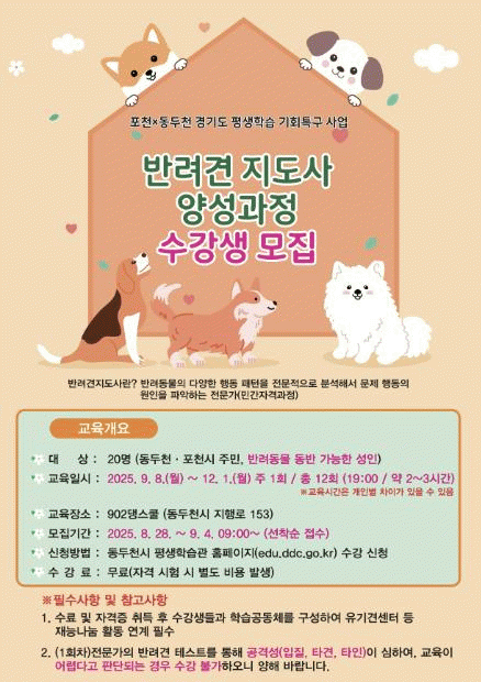 [NWS¹æ¼Û=Çѽ¸ñ ±âÀÚ]µ¿µÎõ½Ã´Â 8¿ù 28ÀϺÎÅÍ 9¿ù 4ÀϱîÁö ¡®2025³â ¹Ý·Á°ß Áöµµ»ç ¾ç¼º°úÁ¤¡¯ ¼ö°­»ýÀ» ¸ðÁýÇÑ´Ù°í ¹àÇû´Ù. À̹ø °úÁ¤Àº ¹Ý·Á°ßÀÇ ÇൿÀ» Àü¹®ÀûÀ¸·Î ºÐ¼®ÇÏ°í ¹®Á¦ ÇൿÀÇ ¿øÀÎÀ» ÆÄ¾ÇÇÒ ¼ö ÀÖ´Â Àü¹®°¡¸¦ ¾ç¼ºÇϱâ À§¡¦