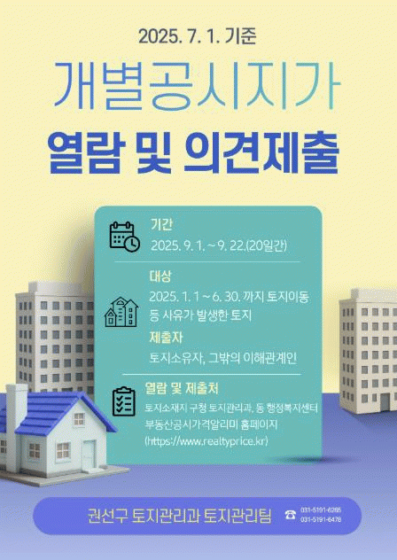 [NWS¹æ¼Û=Çѽ¸ñ ±âÀÚ]¼ö¿ø½Ã ±Ç¼±±¸´Â 2025³â 7¿ù 1ÀÏ ±âÁØÀ¸·Î »êÁ¤ÇÑ °³º°°ø½ÃÁö°¡¿¡ ´ëÇØ ¿À´Â 9¿ù 1ÀϺÎÅÍ 9¿ù 22ÀϱîÁö ¿­¶÷ ±â°£À» ¿î¿µÇϰí, ÅäÁö ¼ÒÀ¯ÀÚ ¹× ÀÌÇØ°ü°èÀÎÀÇ ÀǰßÀ» Á¢¼öÇÑ´Ù°í ¹àÇû´Ù. ±Ç¼±±¸´Â ¸Å³â 2ȸ(1¿ù 1ÀÏ¡¦