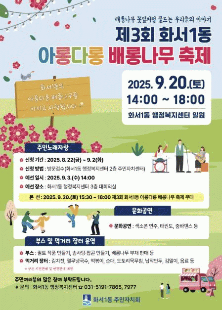 [NWS¹æ¼Û=Çѽ¸ñ ±âÀÚ]¼ö¿ø½Ã ÆÈ´Þ±¸ È­¼­1µ¿ ÁÖ¹ÎÀÚġȸ´Â 8¿ù 22ÀϺÎÅÍ 9¿ù 2ÀϱîÁö ¡®Á¦3ȸ È­¼­1µ¿ ¾Æ·Õ´Ù·Õ ¹è·Õ³ª¹« ÃàÁ¦¡¯ ÁֹΠ³ë·¡ÀÚ¶û ¿¹¼± Âü°¡ÀÚ¸¦ ¸ðÁýÇÑ´Ù. ÁֹΠ³ë·¡ÀÚ¶ûÀº 9¿ù 3ÀÏ ¿¹¼± ½É»ç¸¦ °ÅÃÄ ÃàÁ¦ ´çÀÏÀÎ 20ÀÏ¿¡¡¦