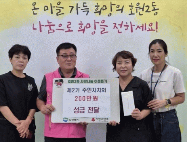 [NWS¹æ¼Û=Çѽ¸ñ ±âÀÚ]ÀÇÁ¤ºÎ½Ã È£¿ø2µ¿Áֹμ¾ÅÍ´Â 8¿ù 25ÀÏ È£¿ø2µ¿ ÁÖ¹ÎÀÚġȸ°¡ Á¦2±â Àӱ⸦ ¸¶¹«¸®ÇÏ¸ç ¾î·Á¿î ÀÌ¿ôÀ» µ½±â À§ÇÑ ¼º±Ý 200¸¸ ¿øÀ» ±âŹÇß´Ù°í ¹àÇû´Ù. È£¿ø2µ¿ ÁÖ¹ÎÀÚġȸ´Â ¡®ÁÖ¹ÎÀÌ ÁÖÀÎ µÇ´Â ¸¶À»¡¯À» ¸ñÇ¥·Î, ÁÖ¡¦