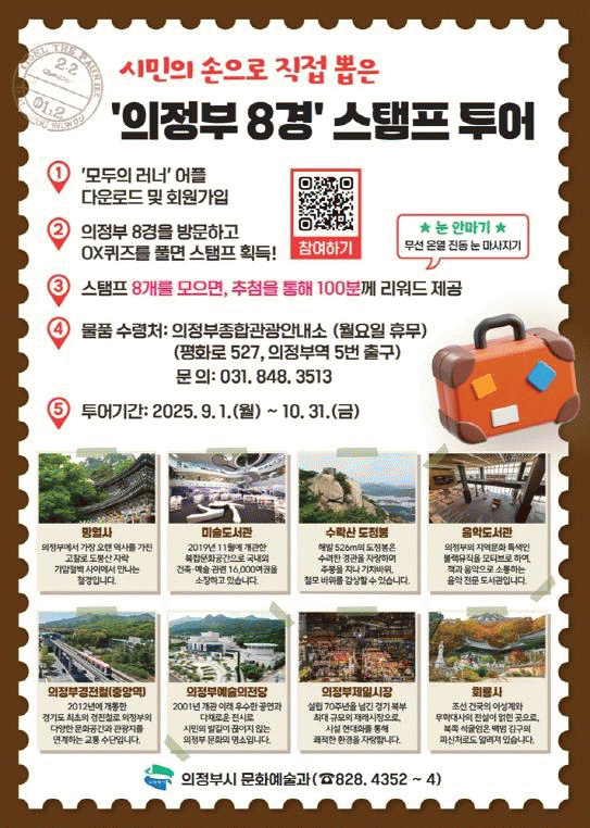[NWS¹æ¼Û=Çѽ¸ñ ±âÀÚ]ÀÇÁ¤ºÎ½Ã´Â 9¿ù 1ÀϺÎÅÍ 10¿ù 31ÀϱîÁö 2025³â ÇϹݱ⠡®ÀÇÁ¤ºÎ8°æ ½ºÅÆÇÁÅõ¾î¡¯¸¦ °³ÃÖÇØ ½Ã¹Î°ú °ü±¤°´À» ¸ÂÀÌÇÑ´Ù. ÀÇÁ¤ºÎ8°æ ½ºÅÆÇÁÅõ¾î´Â ÅõÇ¥¿Í Âü¿©·Î ¼±Á¤µÈ ´ëÇ¥ ¸í¼Ò 8°÷À» ޹æÇÏ¸ç °ü±¤ÀÚ¿øÀÇ ¸Å·ÂÀ» ¡¦