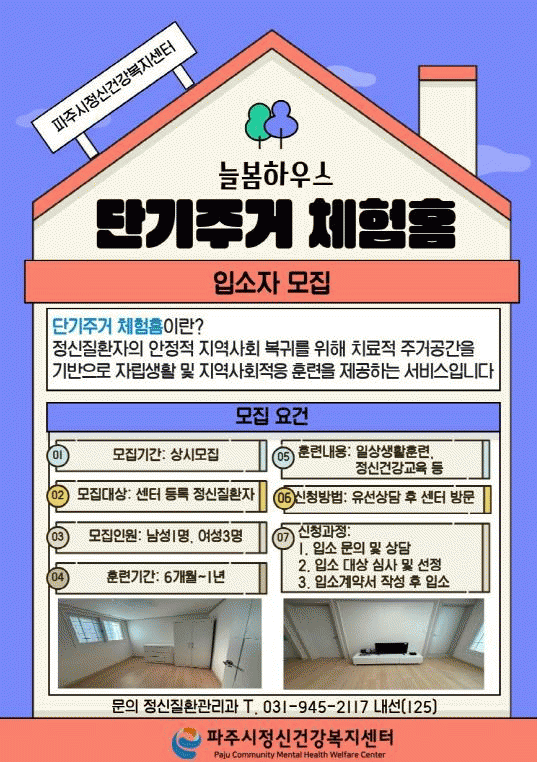 [NWS¹æ¼Û=Çѽ¸ñ ±âÀÚ]ÆÄÁÖ½ÃÁ¤½Å°Ç°­º¹Áö¼¾ÅÍ´Â 2026³â 3¿ù ½ÃÇà ¿¹Á¤ÀÎ 'ÅëÇÕµ¹º½Áö¿ø¹ý' ÃëÁö¿¡ µû¶ó Á¤½ÅÁúȯÀÚÀÇ ÀÚ¸³°ú ȸº¹À» Áö¿øÇϱâ À§ÇØ ¡®´Ü±âÁÖ°ÅüÇèȨ ´Ãº½ ÇϿ콺¡¯ ÀÔ¼ÒÀÚ¸¦ ¸ðÁýÇÑ´Ù°í ¹àÇû´Ù. 2025³â ¼¾ÅÍ ¡¦