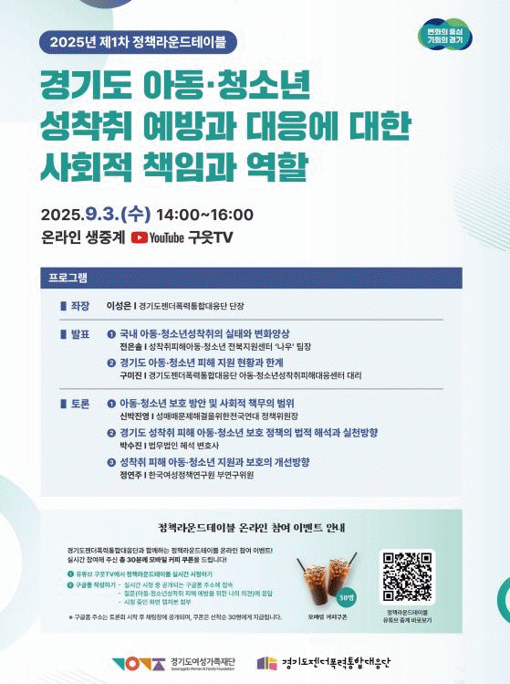 [NWS¹æ¼Û=Çѽ¸ñ ±âÀÚ]°æ±âµµ¿Í °æ±âµµ¿©¼º°¡Á·Àç´Ü Á¨´õÆø·ÂÅëÇÕ´ëÀÀ´ÜÀº ¿À´Â 9¿ù 3ÀÏ ¿ÀÈÄ 2½Ã, ¡®°æ±âµµ ¾Æµ¿¡¤Ã»¼Ò³â ¼ºÂøÃë ¿¹¹æ°ú ´ëÀÀ¿¡ ´ëÇÑ »çȸÀû Ã¥ÀÓ°ú ¿ªÇÒ¡¯À» ÁÖÁ¦·Î Á¤Ã¥ ¶ó¿îµåÅ×À̺íÀ» °³ÃÖÇÑ´Ù. 9¿ù ù ÁÖ ¾ç¼ºÆòµî¡¦