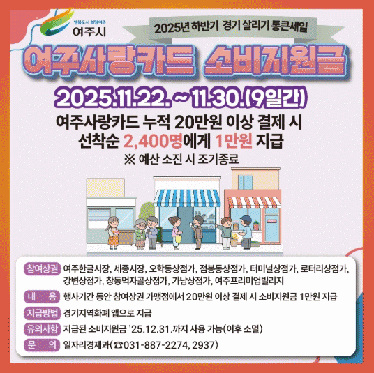 [°æÁ¦] ¿©ÁÖ½Ã, 2025³â ÇϹݱ⠰æ±âµµ ÅëÅ«¼¼Àϰú ÇÔ²²ÇÏ´Â '¿©ÁÖ»ç¶ûÄ«µå ¼ÒºñÁö¿ø±Ý' Áö¿ø |2025. 11.18
